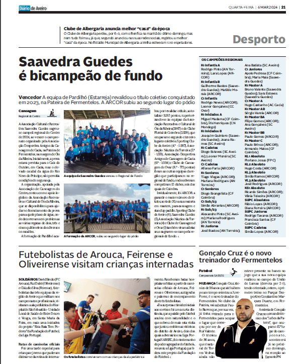 Saavedra Guedes é bicampeão de fundo A equipa de Pardilhó (Estarreja) revalidou o título coletivo conquistado em 2023 na Pateira de Fermentelos In “Diário de Aveiro de 06 março 2024”, do nosso parceiro Ler Noticia
